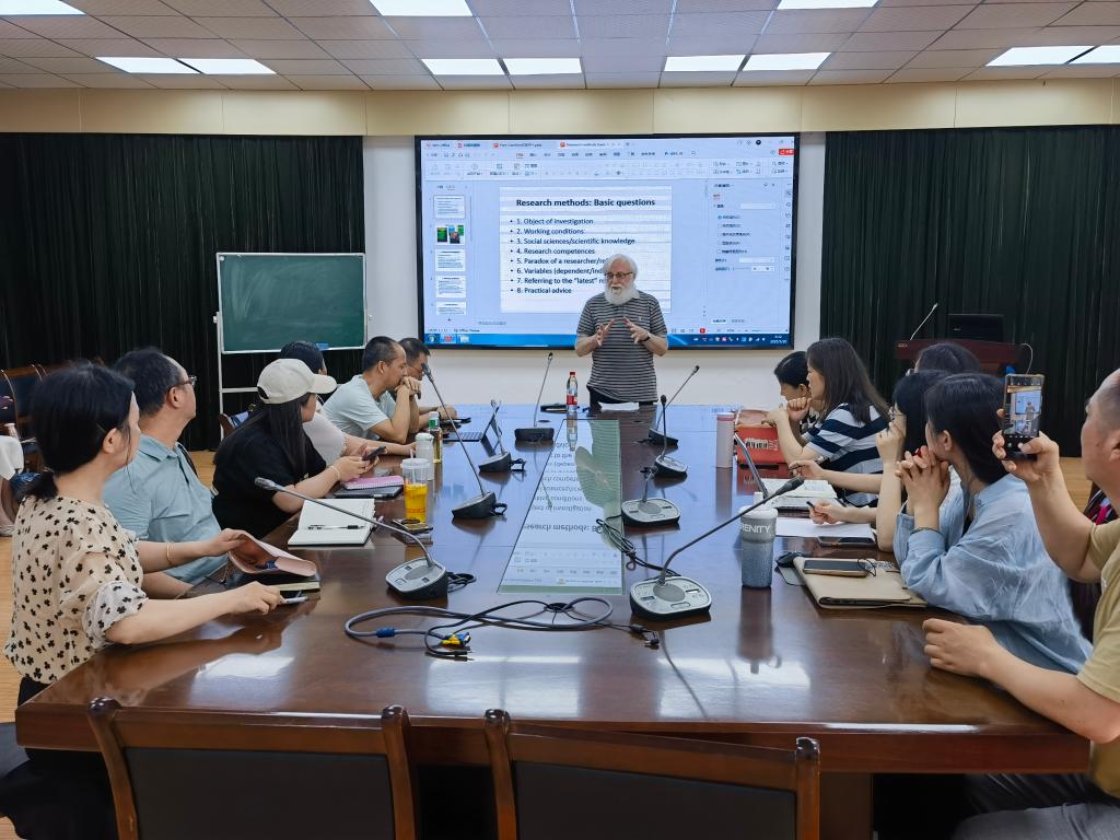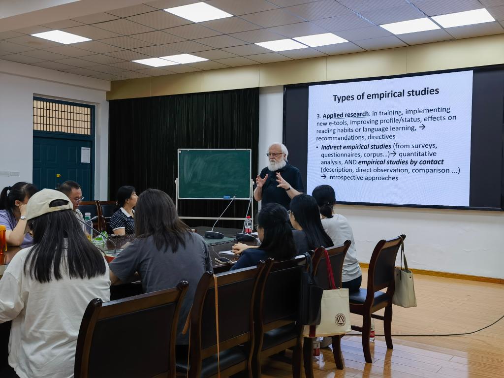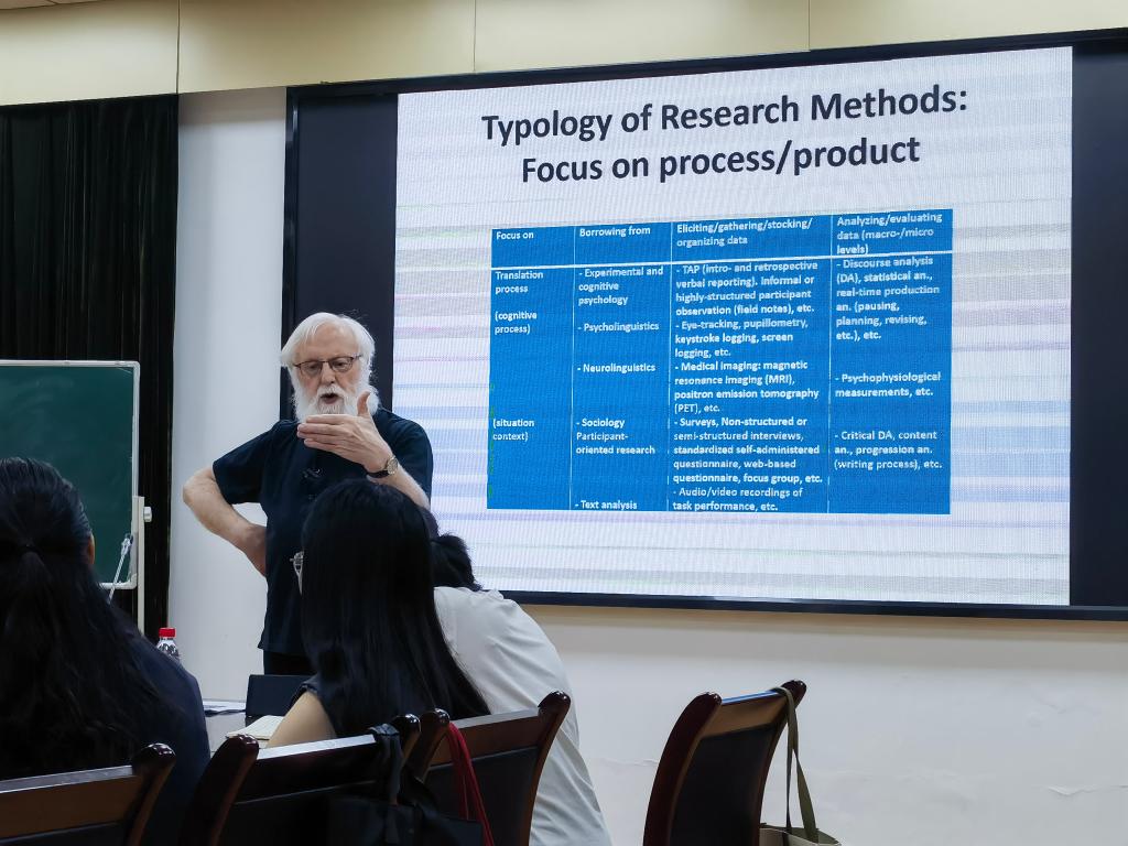 5月20日及5月21日,他分别以“Research Methods: Basic Questions"及"Research Methods: Types”为主题,面向学科核心团队成员、科研团队及青年教师群体,系统阐述翻译学研究方法论,包括研究方法的类型学、研究设计、数据收集与分析等,并重点介绍了广泛应用的实证研究类型。