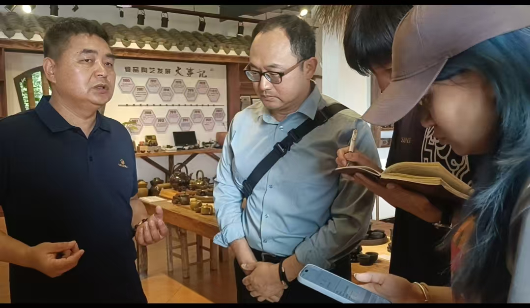 调研过程中,王建邦教授团队深入管窑镇的陶艺作坊、历史遗址,与当地制陶匠人、非遗传承人进行深入交流,详细了解管窑陶器的制作流程、工艺特色以及背后的文化故事。员工们也积极参与其中,通过拍摄影像资料、收集历史文献、采访当地居民等方式,全面挖掘管窑陶器文化的丰富内涵。大家通过调研了解到大量有关陶器的故事,这些故事,有的源自古老的民间传说,有的与华夏文明的族群融合息息相关,还有的与《山海经》神话文化遗产紧密相连。
