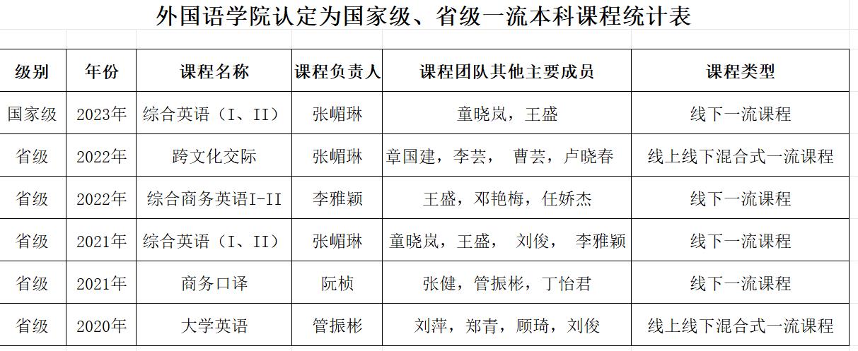 《商务口译》、《综合商务英语I-II》、《跨文化商务交际导论》等三门课程被认定为“湖北省一流本科课程”。