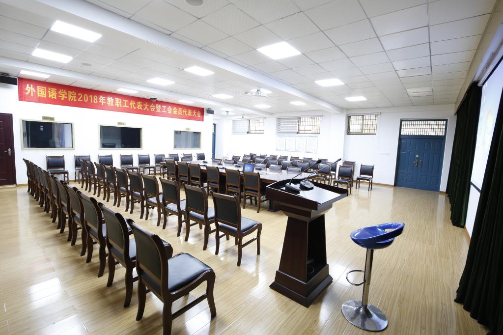 口译与会展模拟实训室于2014年建成,位于X2三楼(304室),总面积133多平方米,可容纳正式会议代表120多名,另设2个同传译员间,和1个设备间。主要用于口译、商务谈判、演讲与辩论等课程及语言实训项目。口译与会展模拟实训室的建设充分考虑了今后应用于英语高级口译人才培养对同传设备和训练环境的要求,选配了德国Bosch数字会议系统和同声传译系统,融国际会议、同声传译、会议发言、视频采集等功能于一体。该室另安装了上海卓越K8录播系统,可对会议、实训课等进行录播。口译与会展模拟实训室的建成,不仅将成为黄石市第一个服务于国际会议需求的多语种交流环境,也是第一个集同声传译人才培训与国际会议实用功能于一体的实验教学环境。