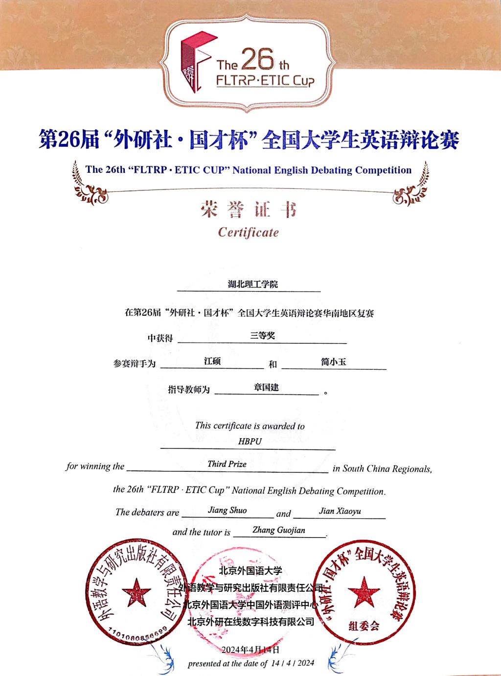 第26届“外研社·国才杯”全国老员工英语辩论赛华南地区复赛三等奖--江硕、简小玉