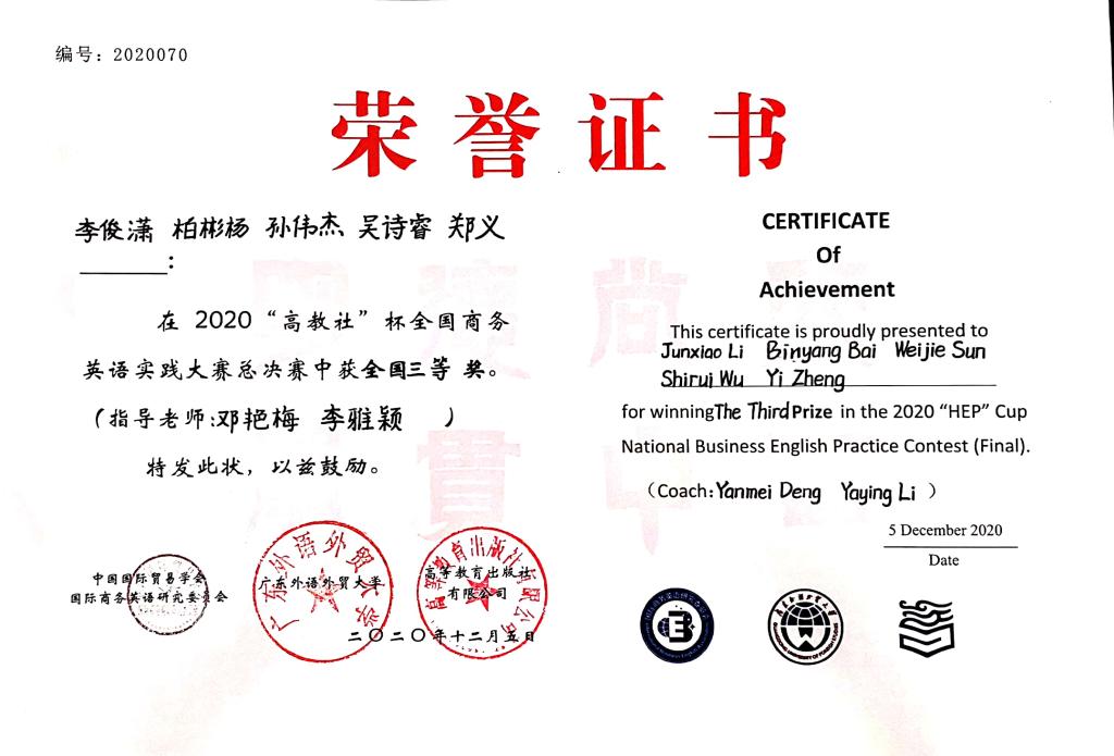 2020“高教社”杯全国商务英语实践大赛总决赛全国三等奖